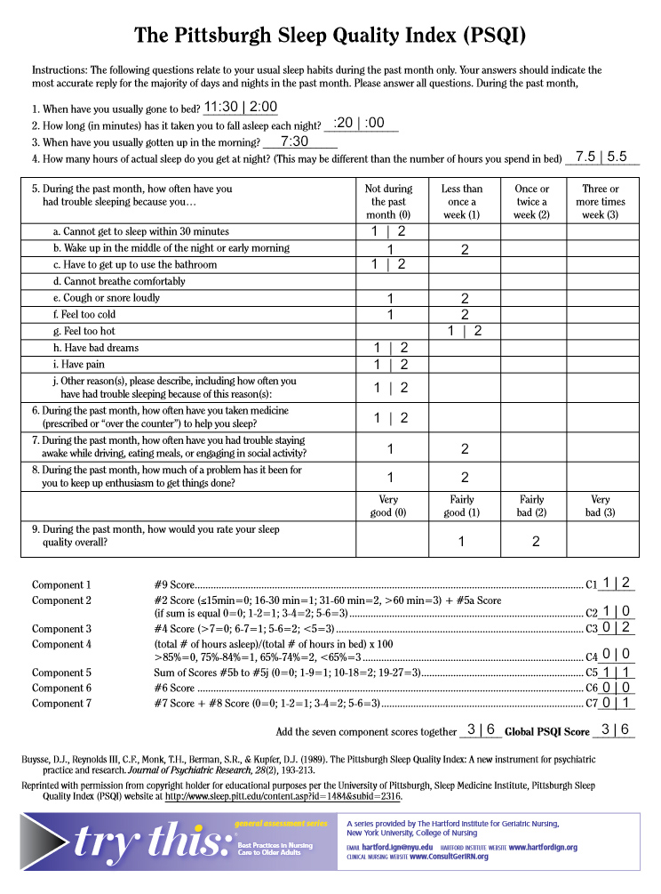I took this test twice – once based on my current / new sleep schedule, and the second based on my old sleep schedule so I could see the difference. Here were my results (click the image to enlarge). New habits are noted as 1, old habits as 2. I found that my sleep quality is twice as good as it used to be. A score of 5 or higher indicates poor sleep quality and since I moved from a 6 to a 3, I think my original conclusion is accurate; as long as I’m getting the right AMOUNT of sleep, it doesn’t seem that my sleep quality is suffering.