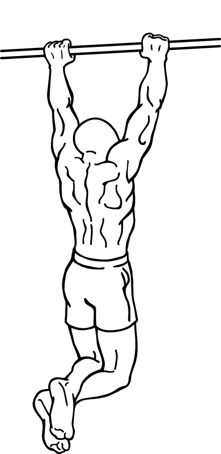 1The starting point of the exercise will be in a hanging position underneath a bar. Your feet should be off the ground – bend your knees if you’re tall like I am. The arms should be fully extended with the biceps next to your ears. The hand position can be either palms facing the bar, or palms facing you. Because the work will be performed by your back, the hands should be in whichever way feels comfortable to you. You should feel a pretty good stretch through your arms and back at the starting point. Breathing can be whatever feels most comfortable as well.