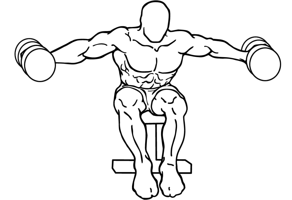 2Inhale and slowly raise the weights out to your sides over a 2 to 3 count. The elbows should remain slightly bent and the hands should stop moving out/upward when they’re parallel to your shoulders. at the top of the movement, squeeze the shoulder blades together using the rhomboids and hold for a 2 count.