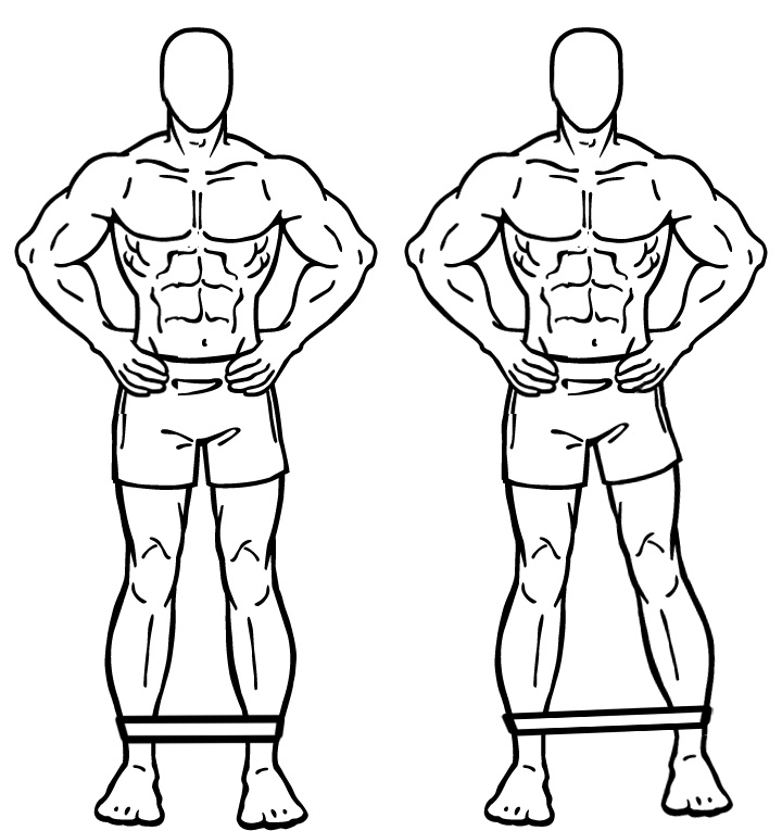 1Place a short flat resistance band round the shins of each leg – just above the ankles – If you have hairy legs, or discomfort, consider wearing a sock that covers the area to keep the band from rubbing on your skin, or pulling on hair! Stand comfortably with the feet under your shoulders, and a slight bend in the knees. There should be a slight tension in the resistance band.