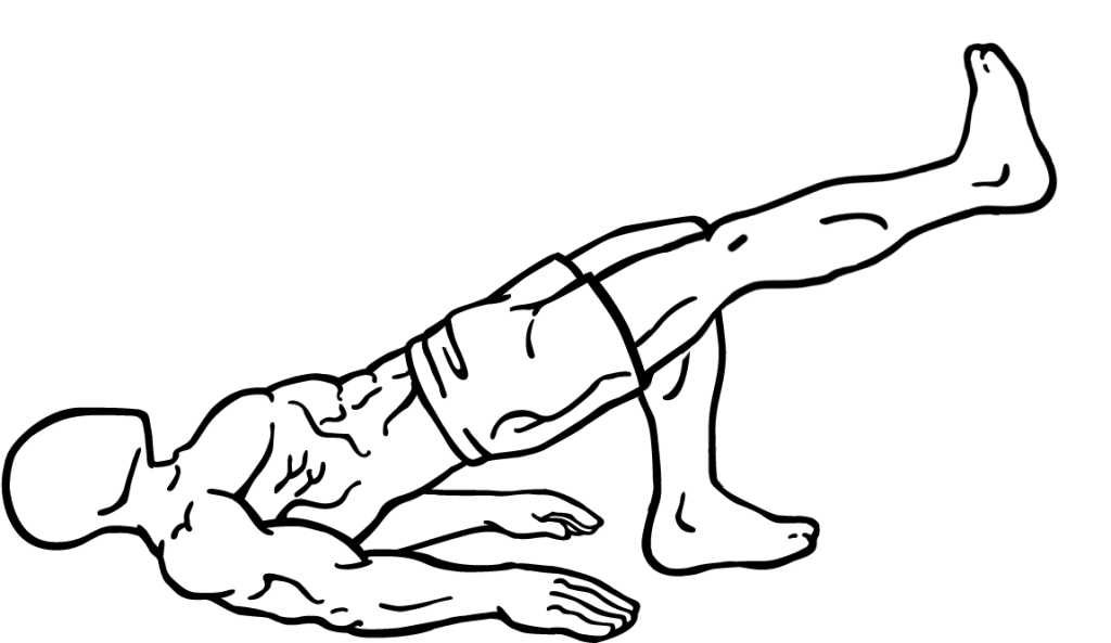 Once in the position described in step 2, your butt and extended leg should not touch the floor until you’re finished with the set and ready to switch to the other leg, or to take a break.