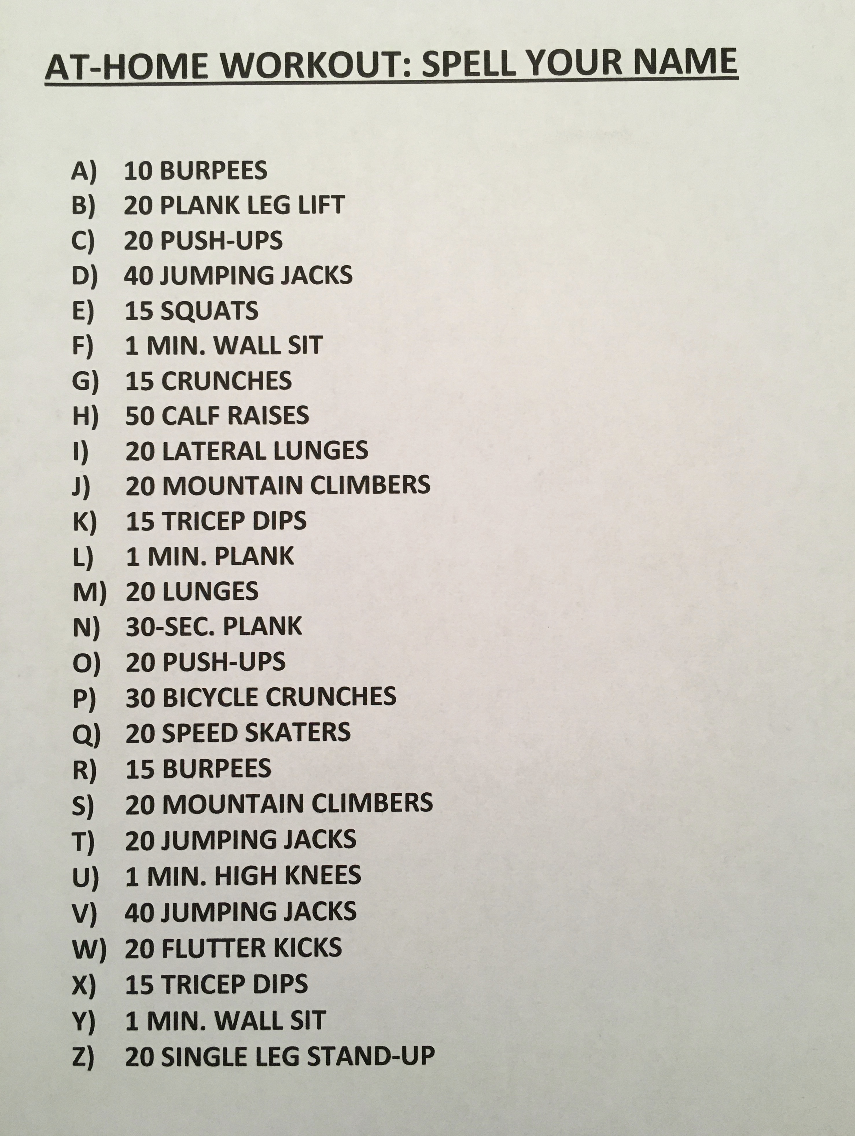 Without further ado, I present torture – I mean workout – option #1: “Spell Your Name”. The premise of this workout id really simple, Print out the chart below. Each letter of the alphabet has an exercise corresponding to it. Spell out your name, and complete each of the exercises corresponding to a letter of your name. First name AND last name. so for example, if your name is “Sam” then you begin with 20 mountain climbers, 10 burpees and 20 lunges – each exercise corresponding to S-A-M. Get it?